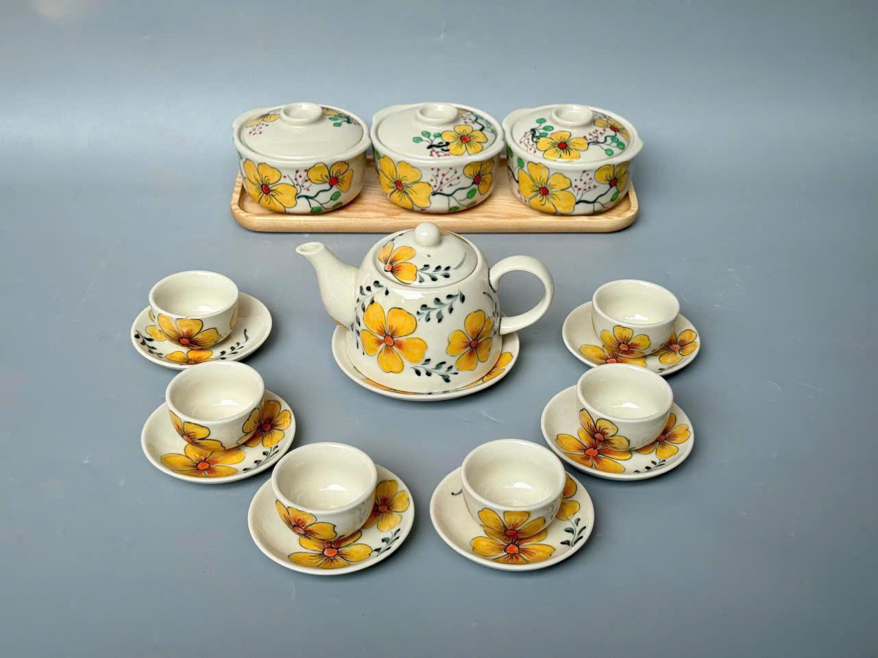 Bộ ấm chén mai vàng, gồm 1 ấm + 6 chén + đĩa lót ấm + đĩa lót chén. Dung tích ấm 350ml: 750.000 VNĐ